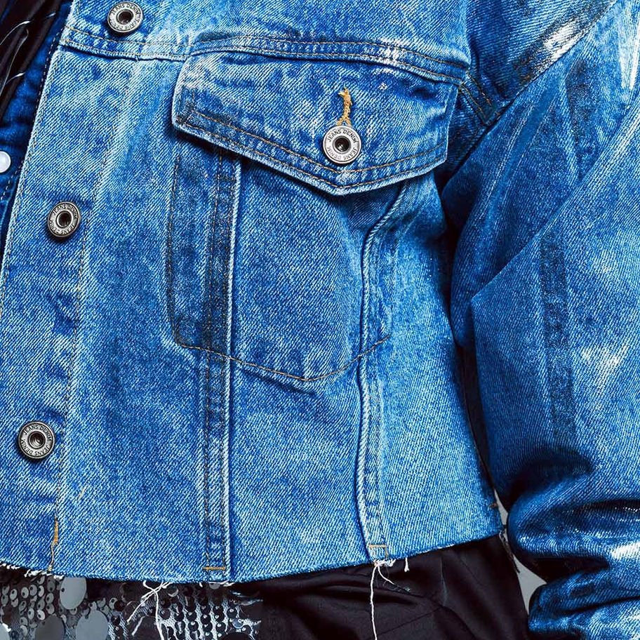 Cropped Denim Jacket With Raw Hem in Mid Wash With Metallic Silver Finish