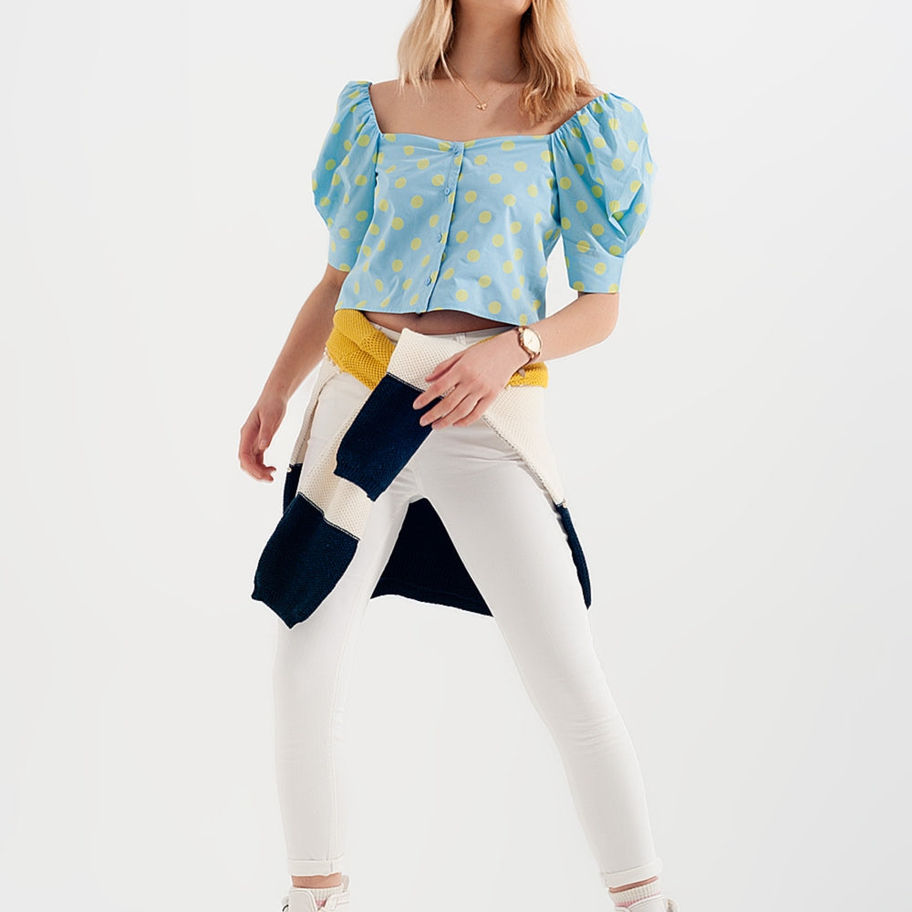 Polka dot top with square neckline elastic on the shoulders puffy sleeves cropped fit with button closure on the front 100% Cotton