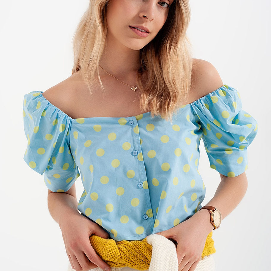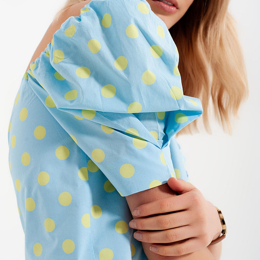 Polka Dot Top With Puffed Sleeves and Square Neckline Blue and Green