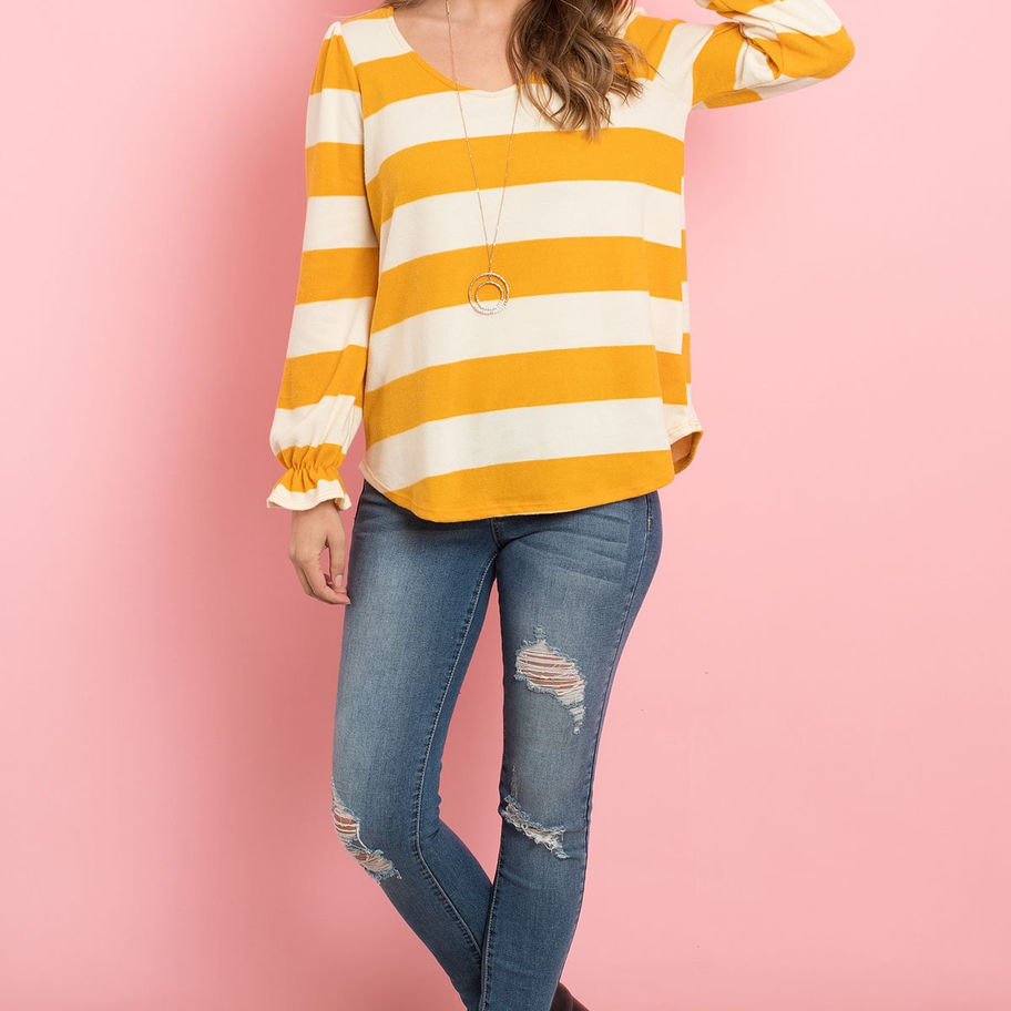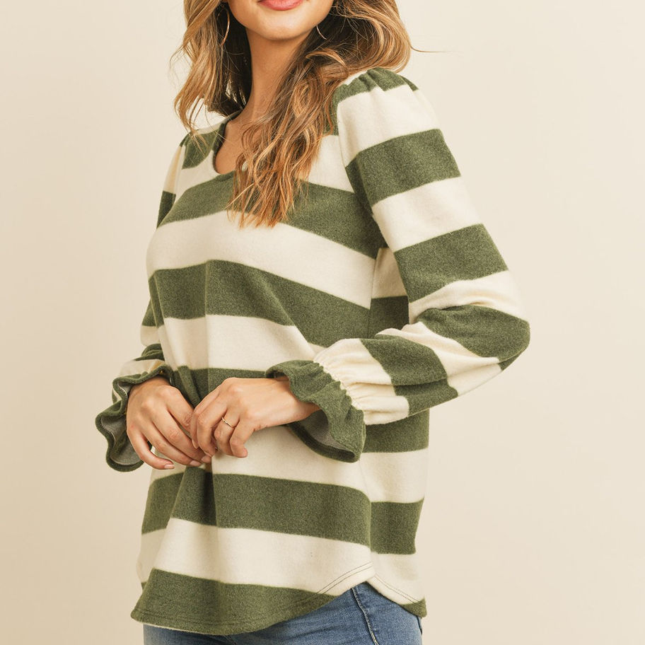 Stripes Ruffle Sleeved Round Hem Hacci Top